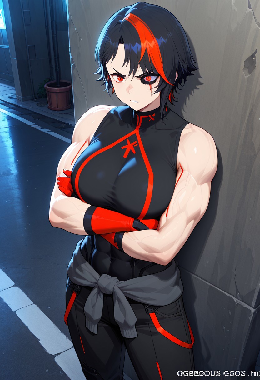 外观:黑发,短发,黑发,彩色头发,挑染发,异色瞳,橙色眼睛,义眼,红眼,面部疤痕,眼影,肌肉发达,身材健美,腹肌,二头肌,大乳房