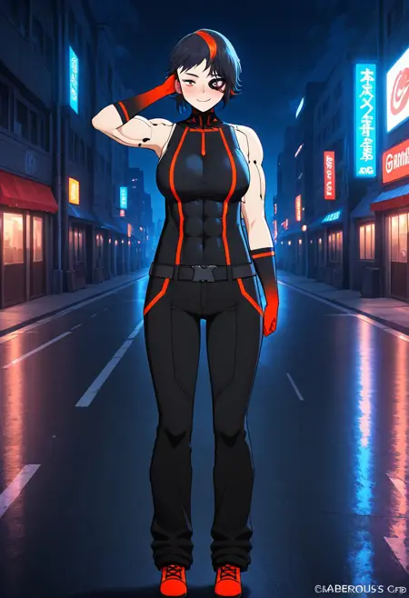 外見: 黒髪、短髪、黒髪、多色髪、ストライプ髪、左右非対称の目、オレンジ色の目、サイバネティックな目、赤い目、顔の傷、アイシャドウ、筋肉質、引き締まった、腹筋、上腕二頭筋、大きな胸
