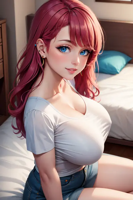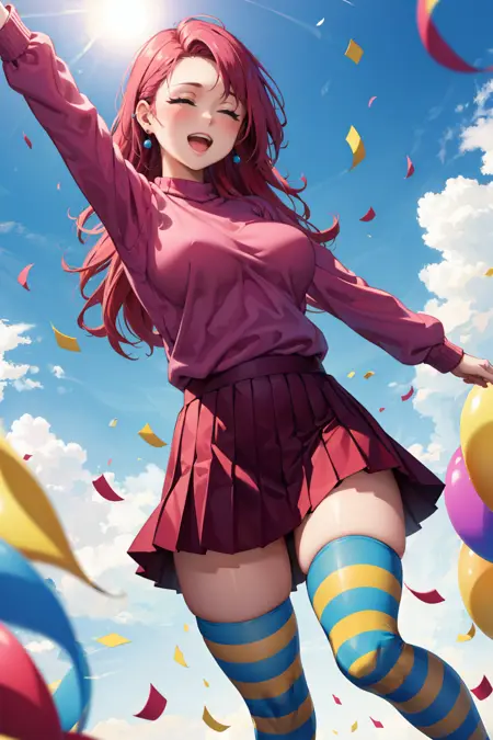 如需呈现她的典型外观,请添加 "耳环、粉色毛衣、粉色裙子、条纹过膝袜"。