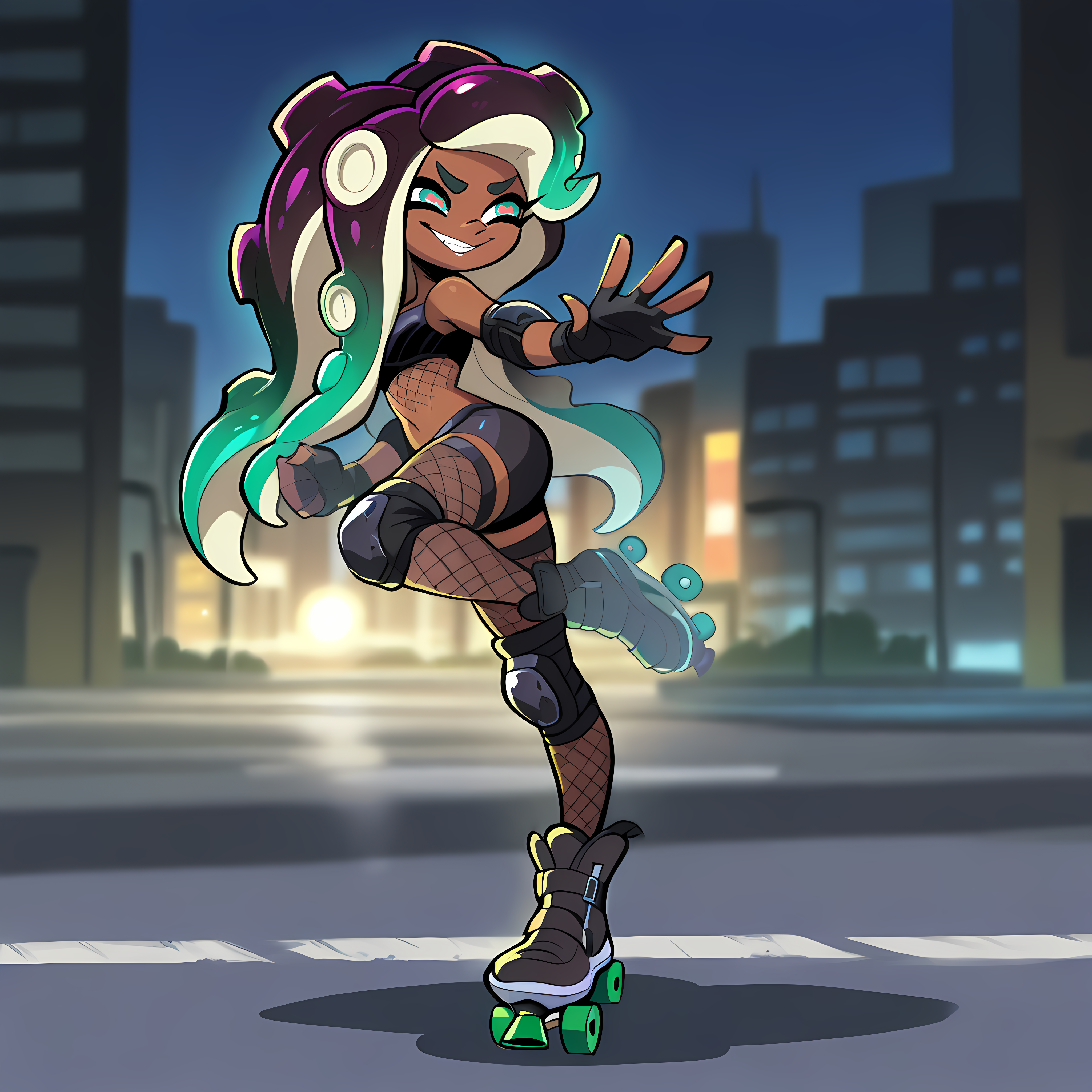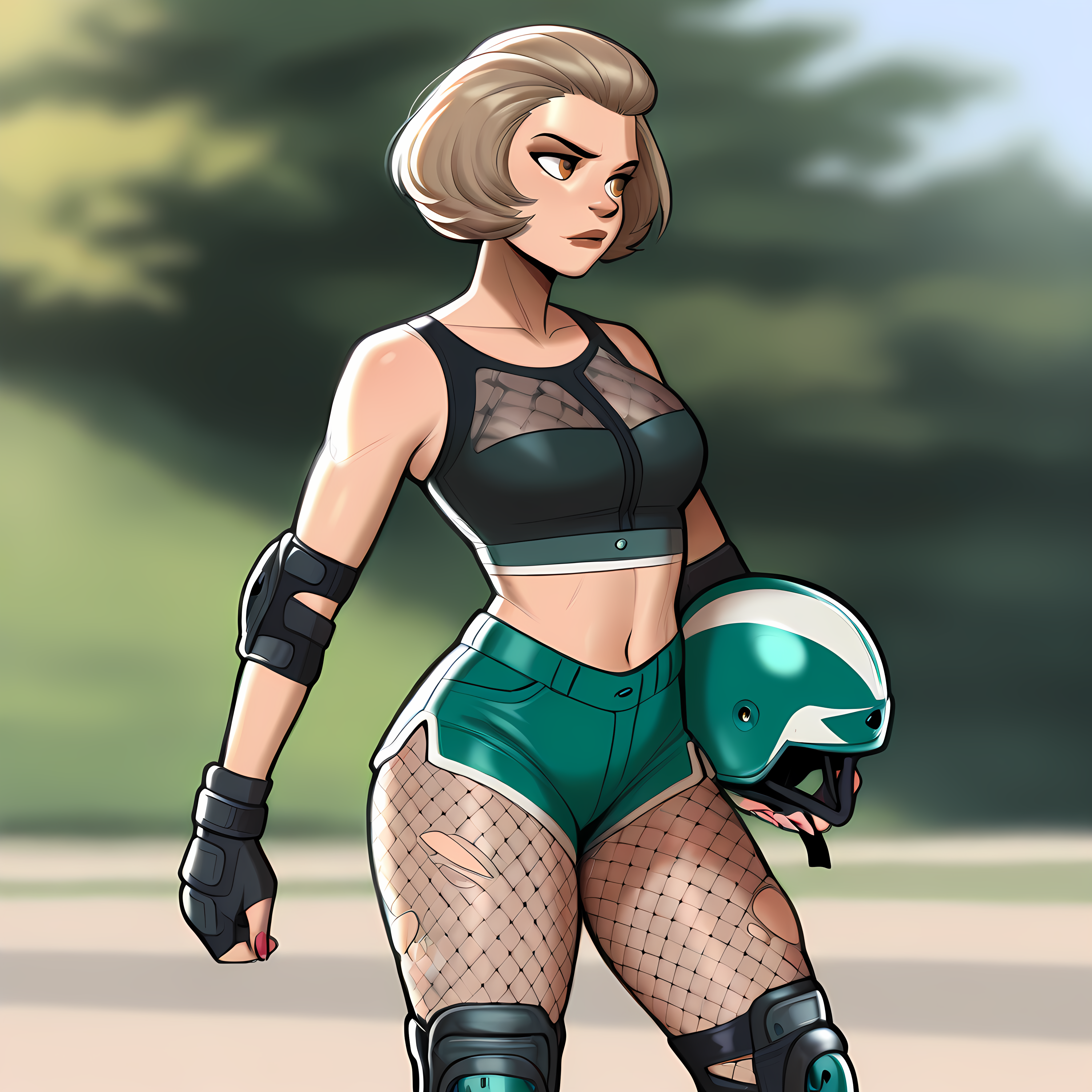 추가: 롤러스케이트, 무릎 패드, 손가락 없는 장갑, 팔꿈치 패드, 인라인 스케이트, 헬멧, 피시넷, 짧은 스커트, 크롭 탑, 찢어진 팬티후스