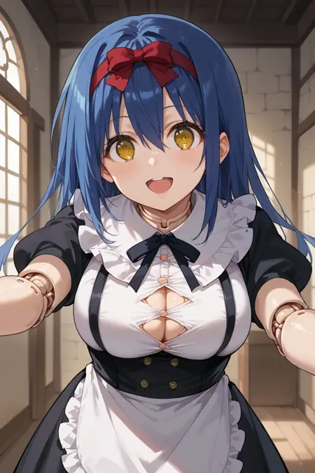 フリル付きのドレス, 黒いドレス, パフスリーブ, メイド, 黒いリボン, 白いシャツ, ボタンの隙間, ボタン, ふくらんだ胸,