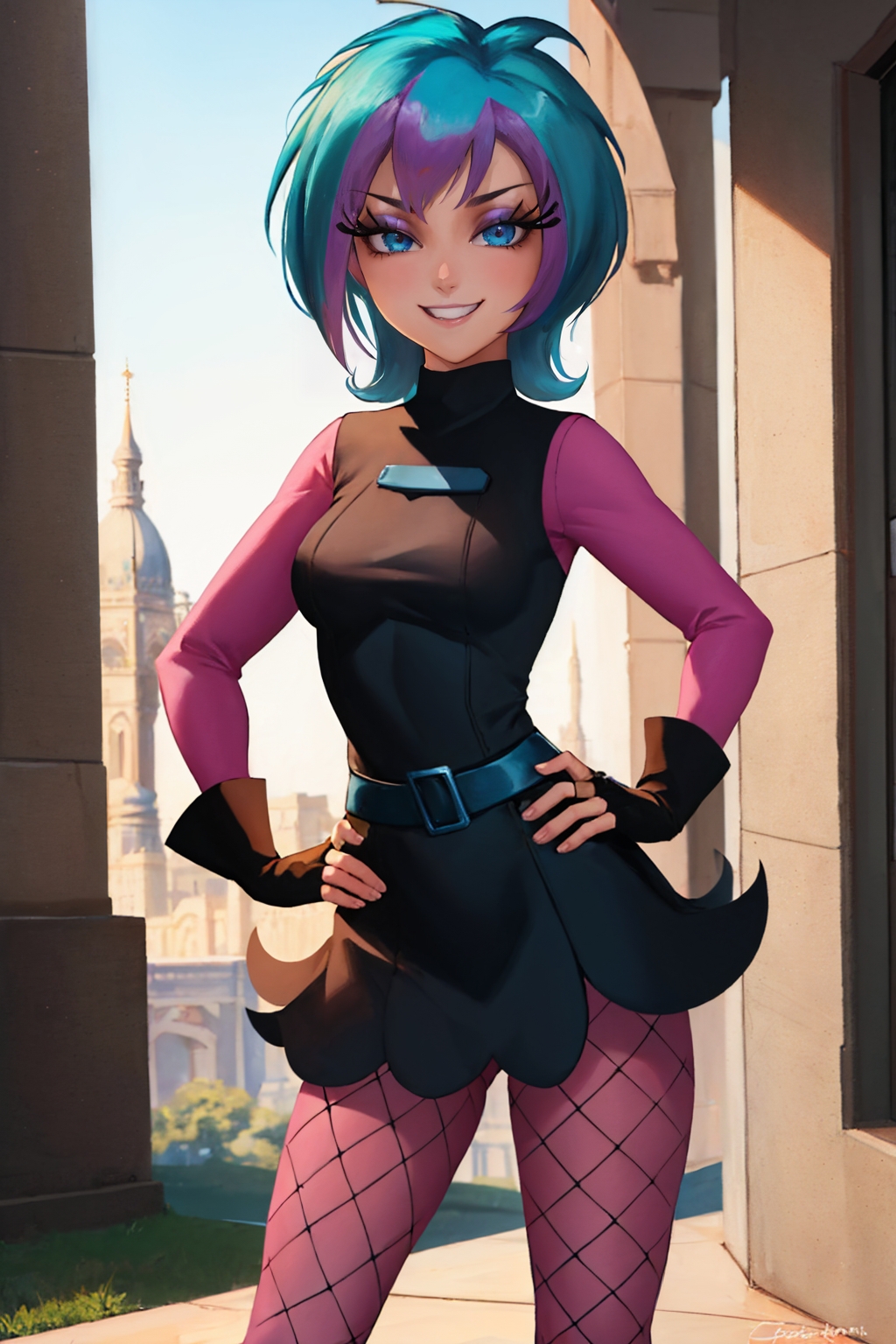 기본 옷차림: dress, long sleeves, fingerless gloves, purple pantyhose, fishnets, high heels