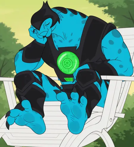 zenblocksn, alien, humanoid, blue skin, spotted skin, yellow sclera, red eyes, mandibles, black helmet, black armor, chest armor, black bracers, black codpiece, black knee pads, ankle armor, green emblem, broad shoulders, thick arms, claws, barefoot, 2 toes, toe claws