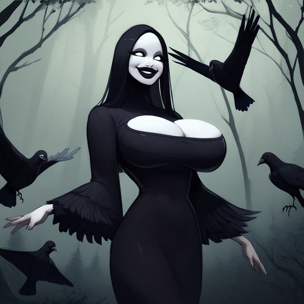 score_9,score_8_up,score_7_up,score_6_up,score_5_up,score_4_up, BlackBird, 1girl, Woman, humanoid, colored skin, white skin, big breast, black hair, long hair, black lips, Big lips, smile, white eyes, black dress, tight dress,