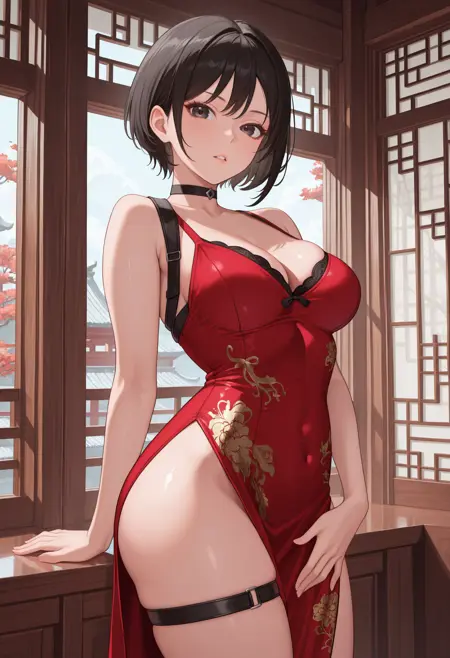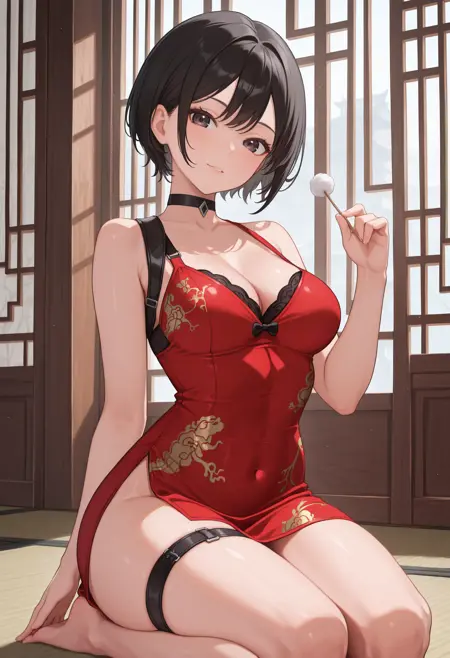 adachina、黒髪、ショートヘア、黒目、中くらいの胸、中国風ドレス、黒チョーカー、胸元、太ももストラップ、サイドスリット、肩出し