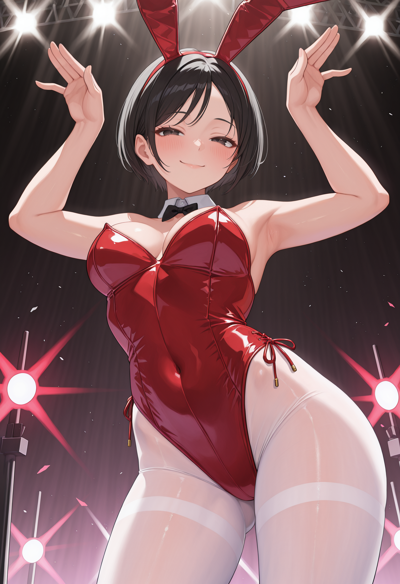 adadress、黒髪、ショートヘア、黒目、中くらいの胸、赤いドレス、短いドレス、ノースリーブ、胸元、チョーカー、黒パンティーハイズ