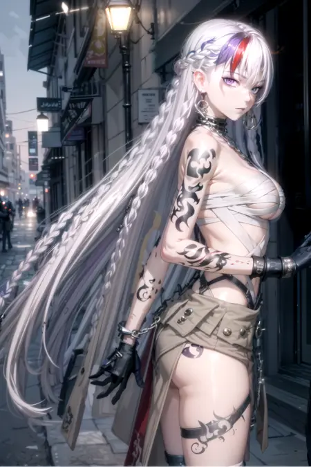 main prompt: 1girloutfit2,heterochromia, red_eyes ,grey_eyes,braid,multicolored_hair,very_long_hair,silver_hair,streaked_hair,white_hair,