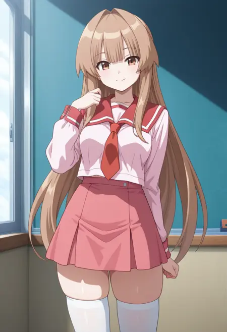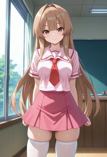 校服、粉红色水手服、红色水手领、粉红色衬衫、长袖、红色百褶裙、绝对领域、白色过膝袜、乐福鞋