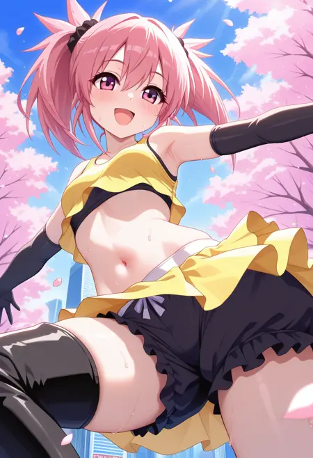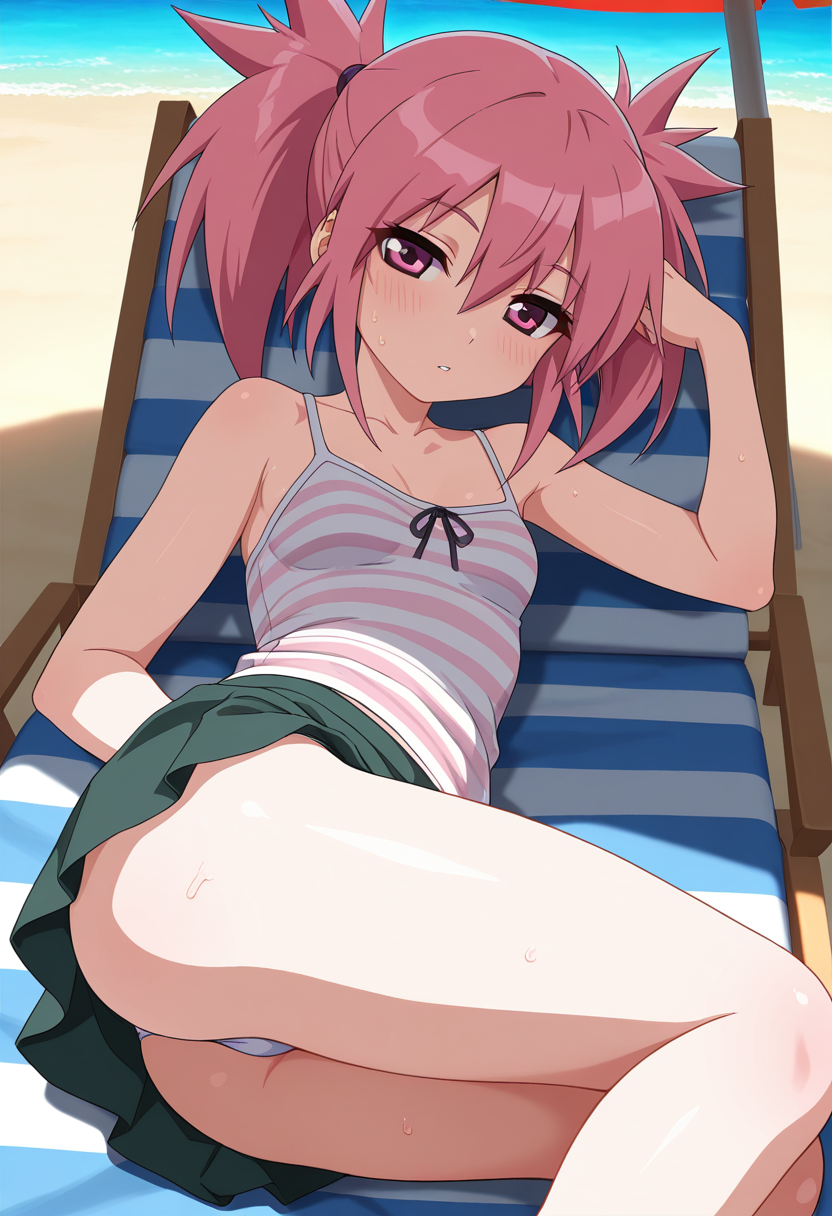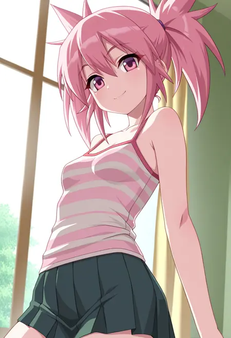- lunarww, pink eyes, pink hair, medium hair, twintails, small breasts,