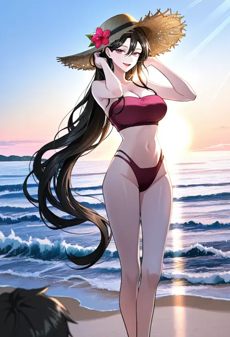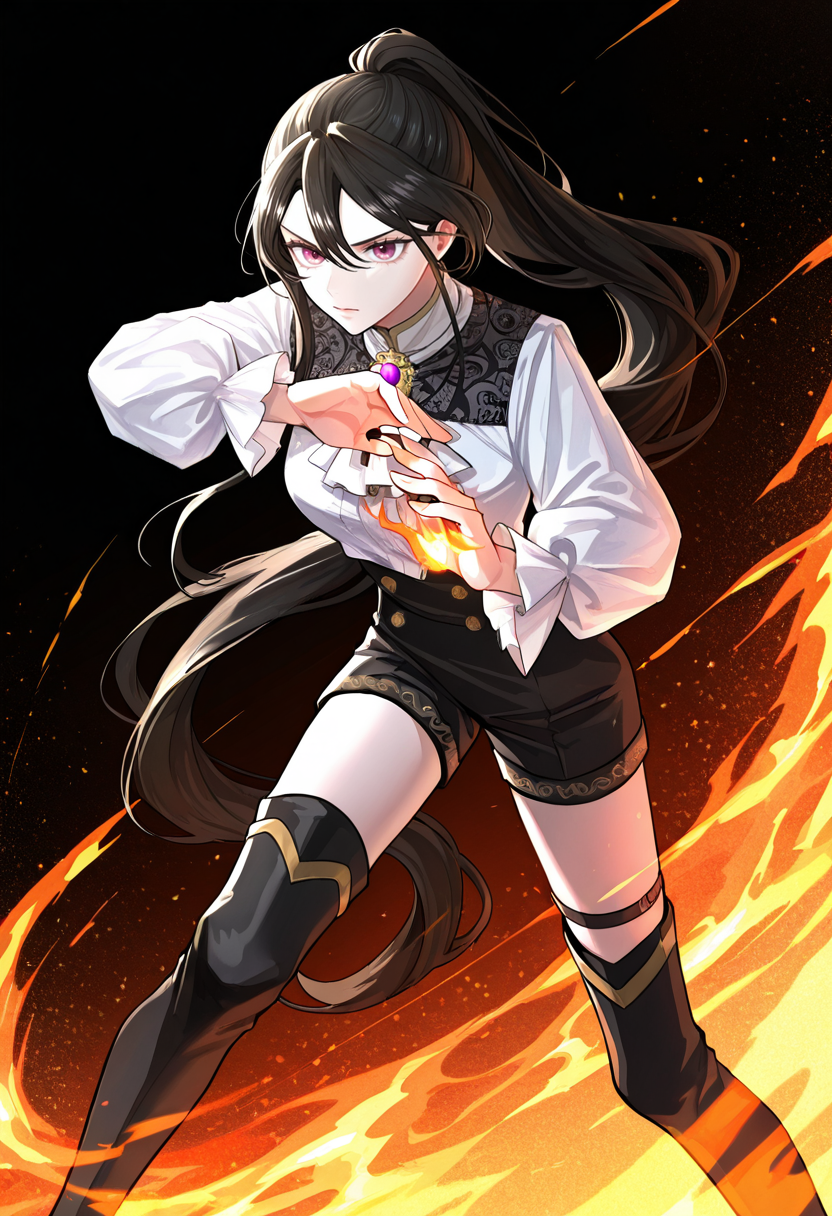 ponytail, white shirt, black shorts, emerald brooch, thigh boots