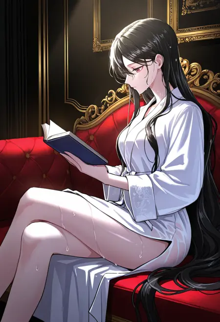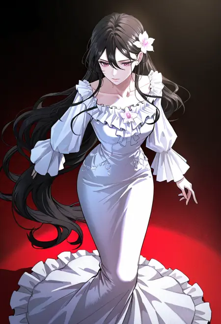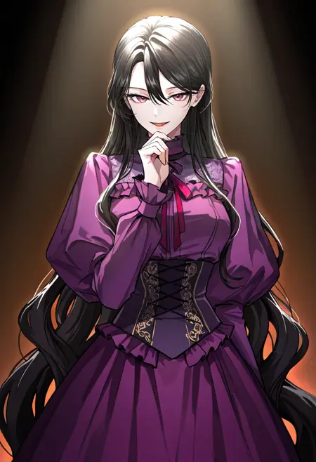 Lars berrier, black hair, very long hair, dark pink eyes, hair between eyes, hair behind ear