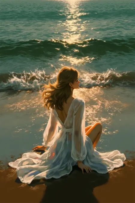 她身后的海洋呈现出深蓝与翠绿交织的迷人景象,轻柔的海浪拍打着海岸。夕阳西下,金色余晖洒在水面上,形成令人惊叹的倒影,为整个场景增添了一丝神秘感。她脚下的沙滩湿润而闪亮,沙粒的细腻纹理清晰可见。整幅画的色调宁静梦幻,完美捕捉了海滨宁静时刻的本质。左下角可见画家的签名,展现出卓越的细节表现力和艺术技巧。