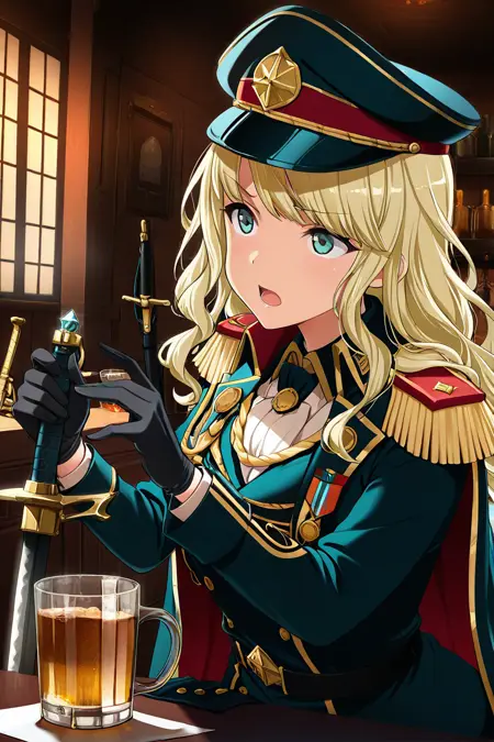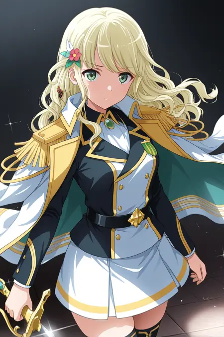 shiori, 1girl, solo, blonde hair, long hair, jacket on shoulders, epaulettes, hair ornament, jacket, smile, cowboy shot, skirt, looking at viewer, flower, single stripe, white jacket, belt, red flower, bangs, miniskirt, buttons, hair flower, closed mouth, long sleeves, stage outfit