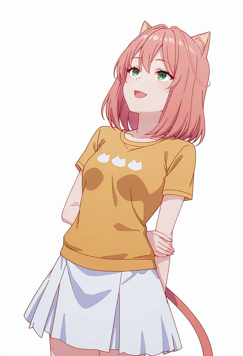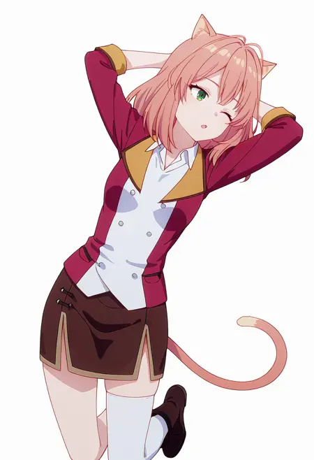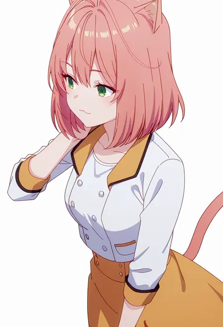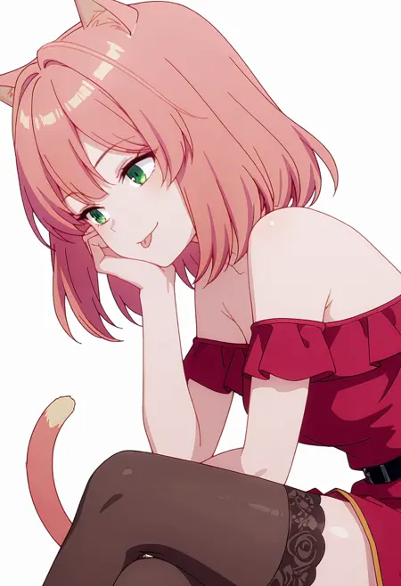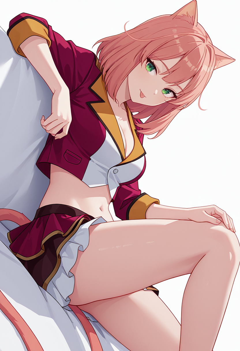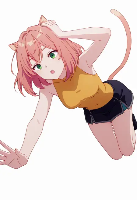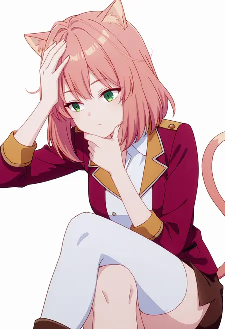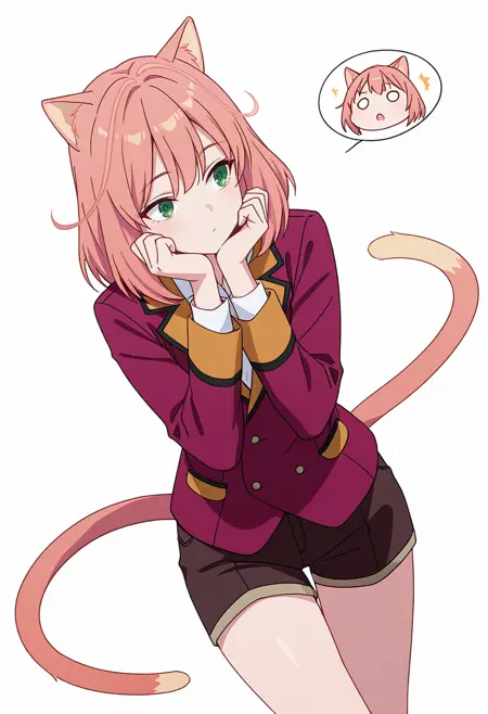 tio_cnr, 1girl,粉色头发,中长发,绿色眼睛,猫耳,猫尾,猫娘,
