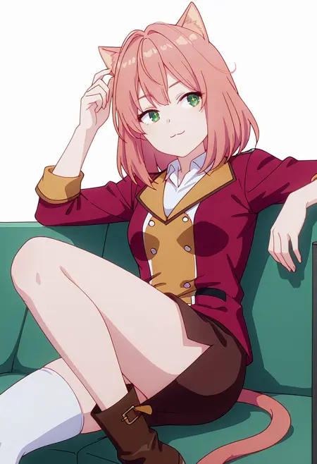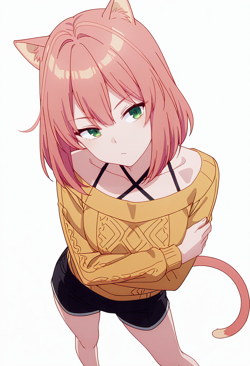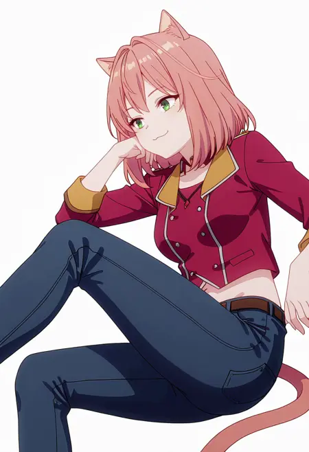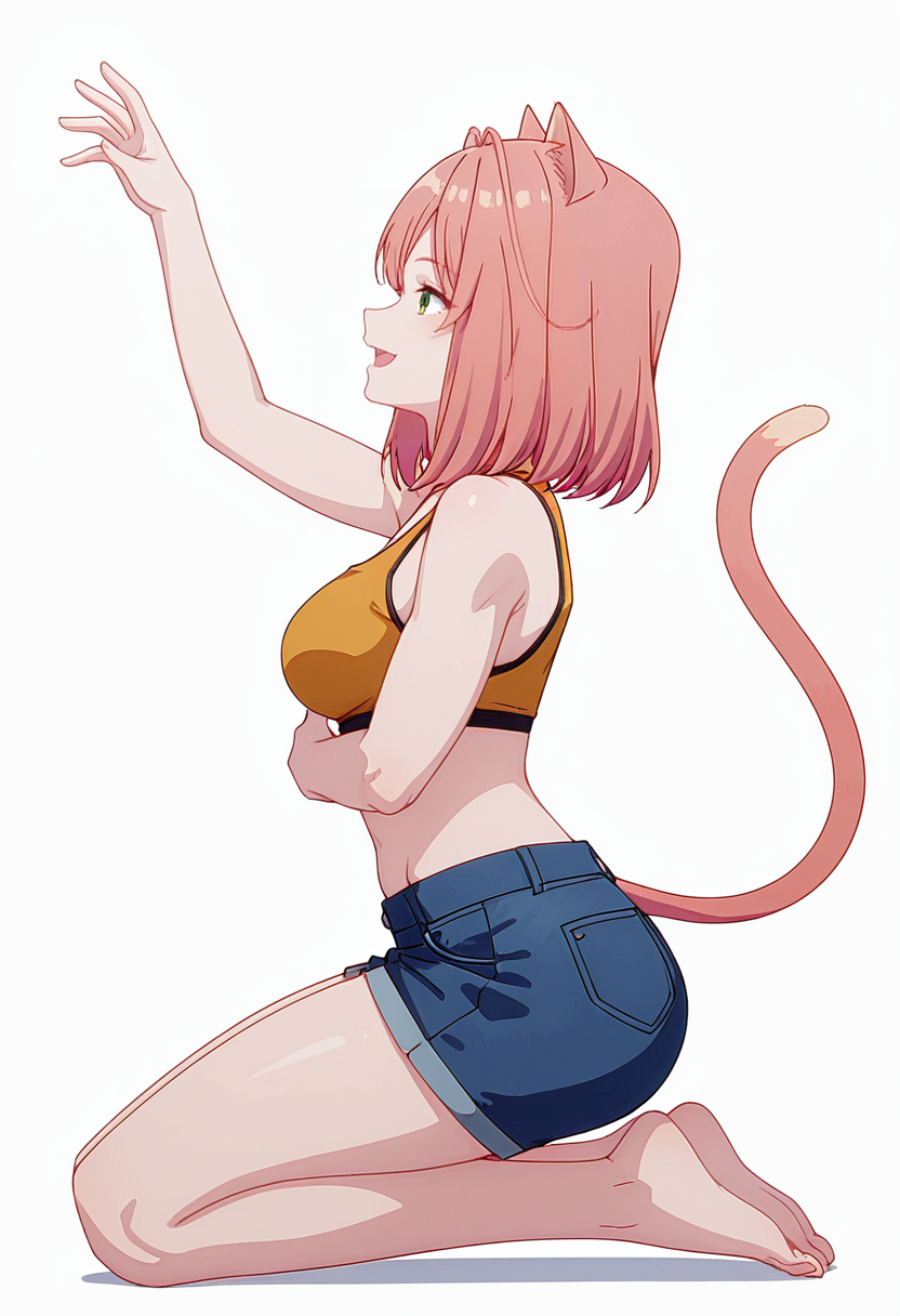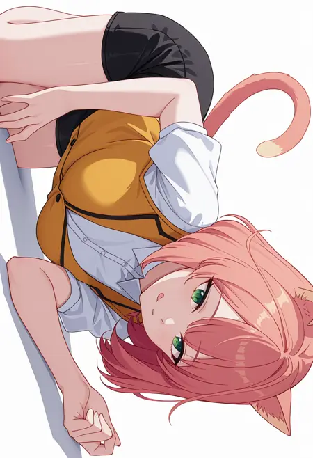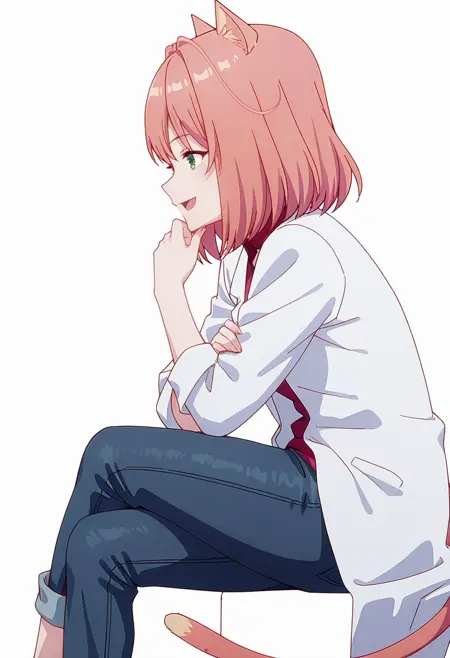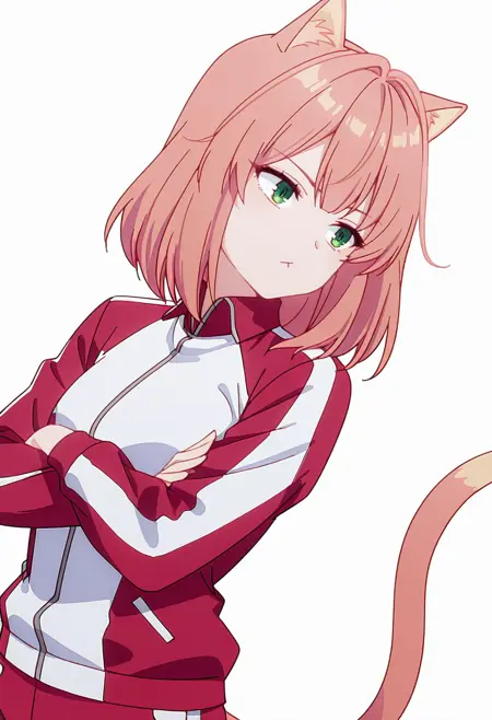 tio_cnr, 1girl,粉色头发,中长发,绿色眼睛,猫耳,猫尾,猫娘,