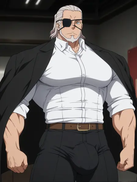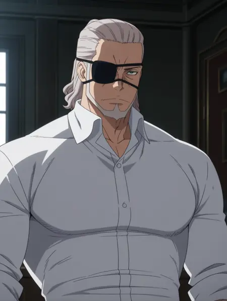 Leonard Burns, eyepatch, beard, shirt, facial hair