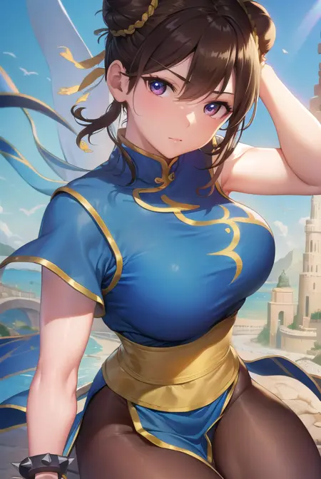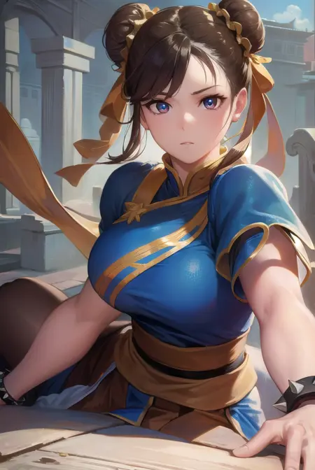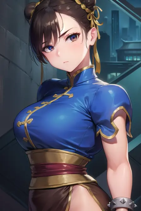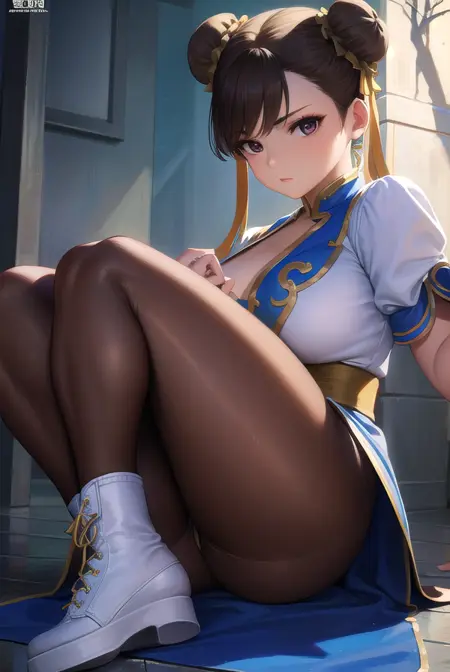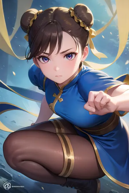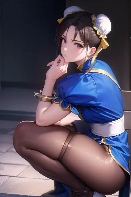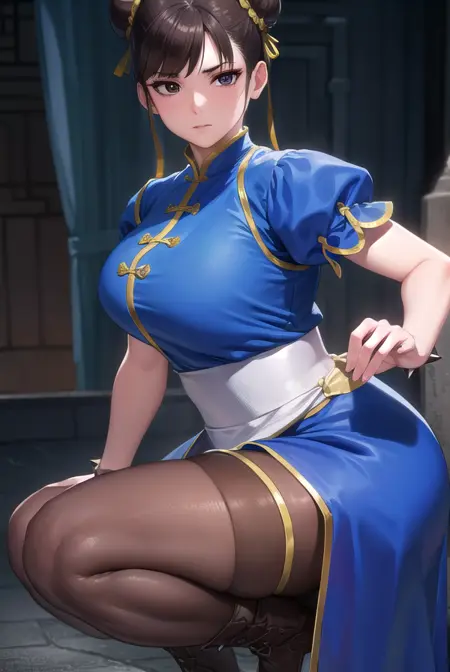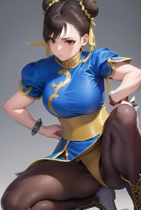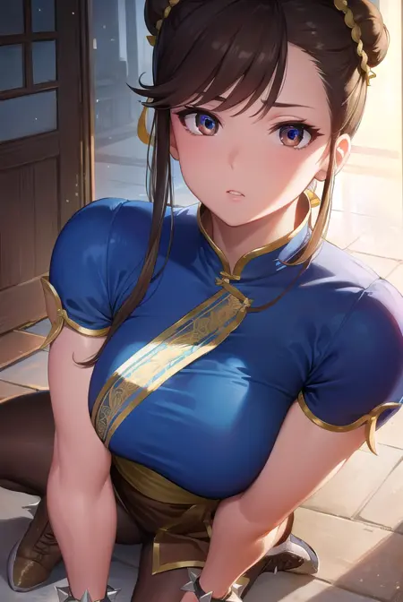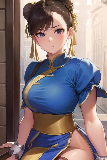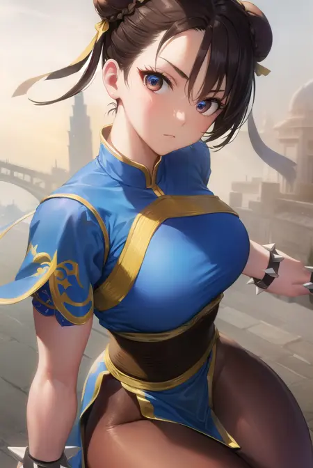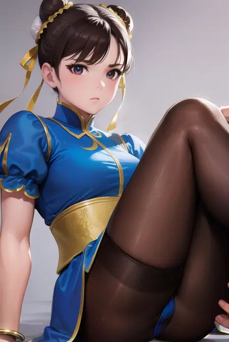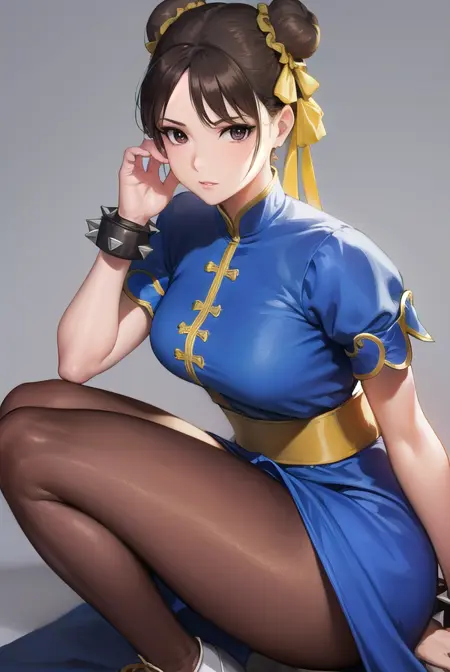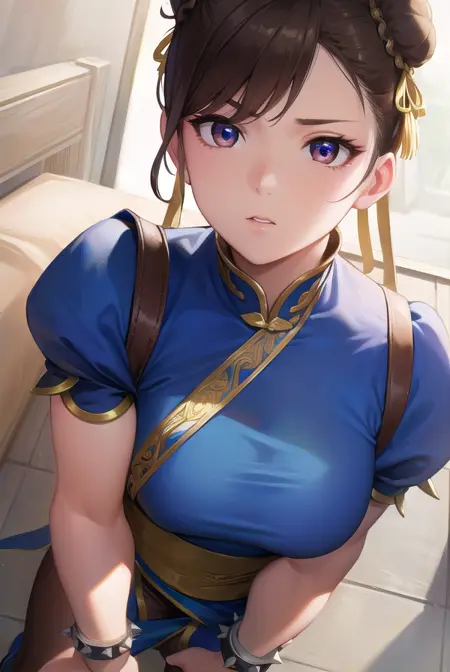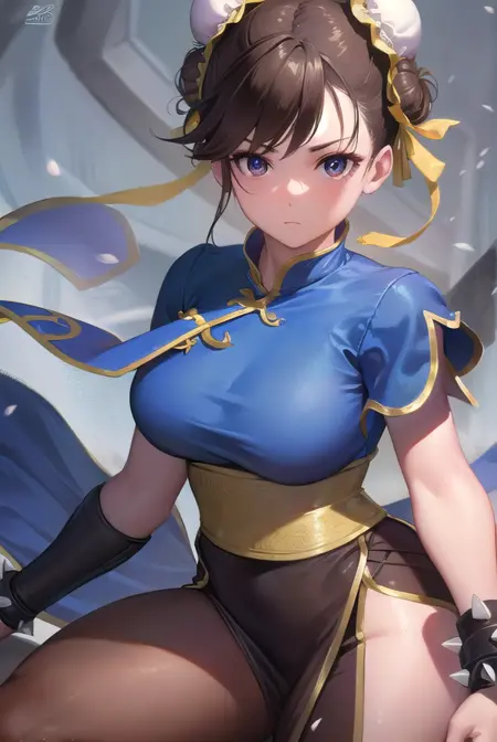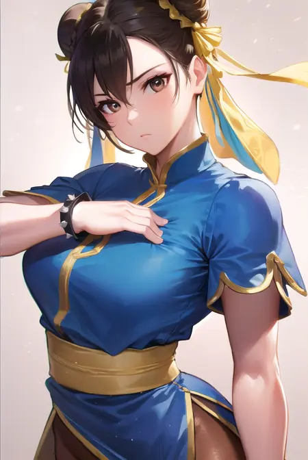 chun li, (brown eyes:1.5), brown hair, bun cover, double bun, eyeliner, hair bun, lipstick, makeup, pink lips,