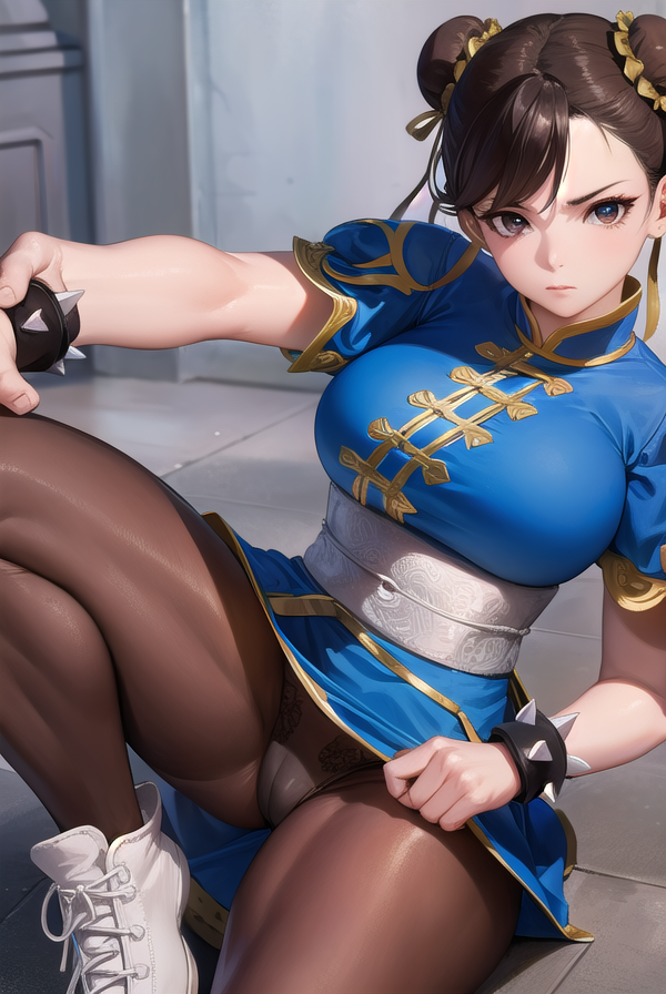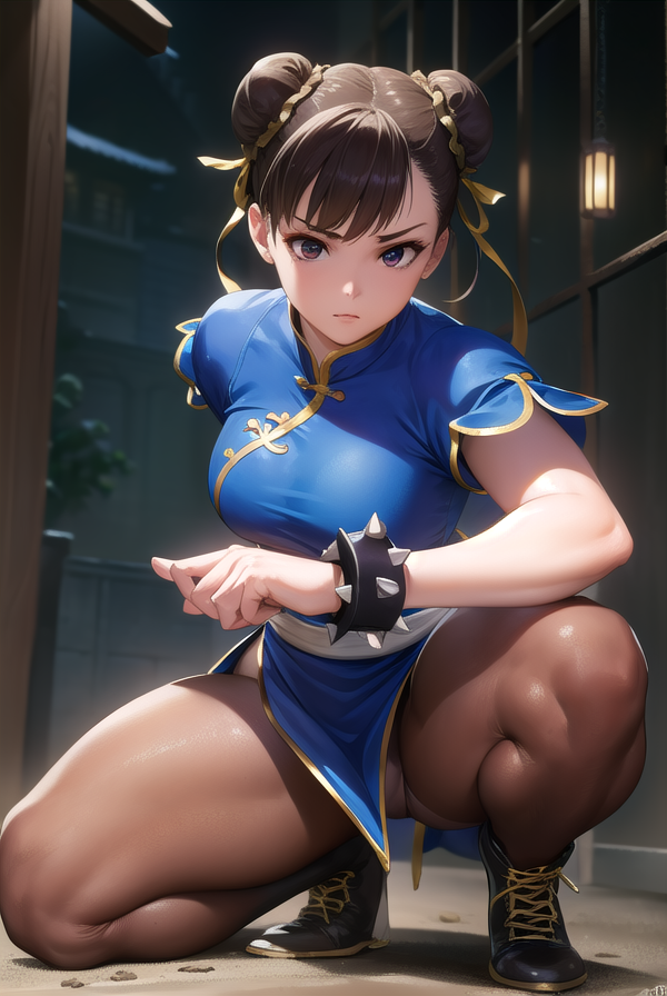 chun li, (brown eyes:1.5), brown hair, bun cover, double bun, eyeliner, hair bun, lipstick, makeup, pink lips,