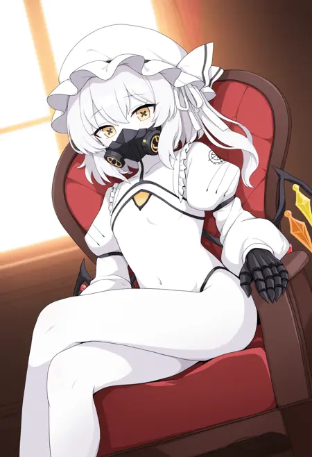 ein (blue archive), 기계 꼬리, 호흡기, 검은 마스크, 기계식 손, 노란 눈, 색상이 있는 피부, 흰 피부, X자 모양의 동공, 기호 모양의 동공
