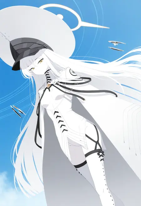 옷: 큰 모자, 허벅지 부츠, 흰 드레스, 망토