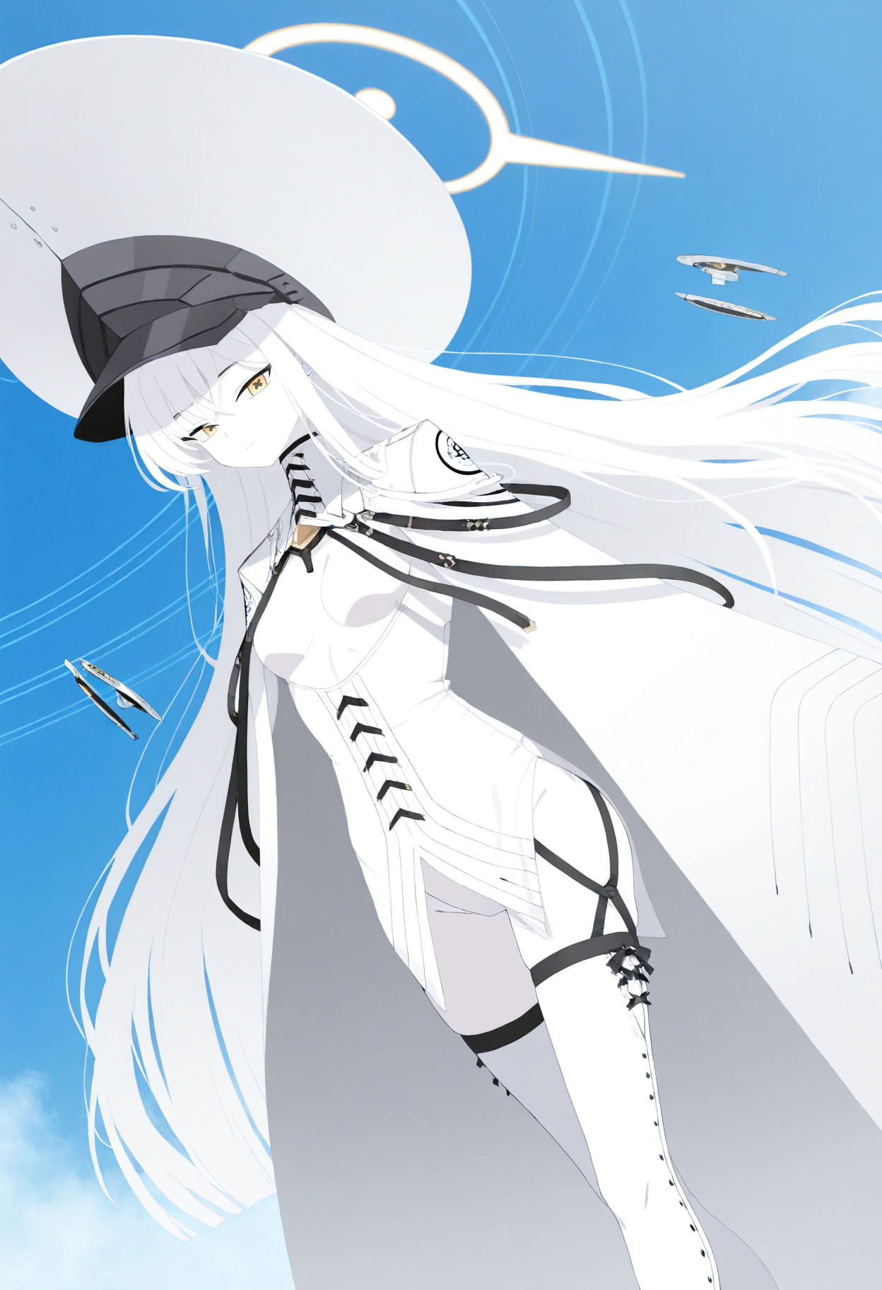 large hat, thigh boots,white dress,cape