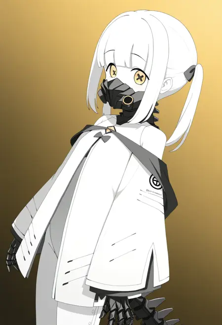 ein \(blue archive\),mechanical tail,respirator,black mask,mechanical hands,yellow eyes,colored skin, white skin, x-shaped pupils, symbol-shaped pupils