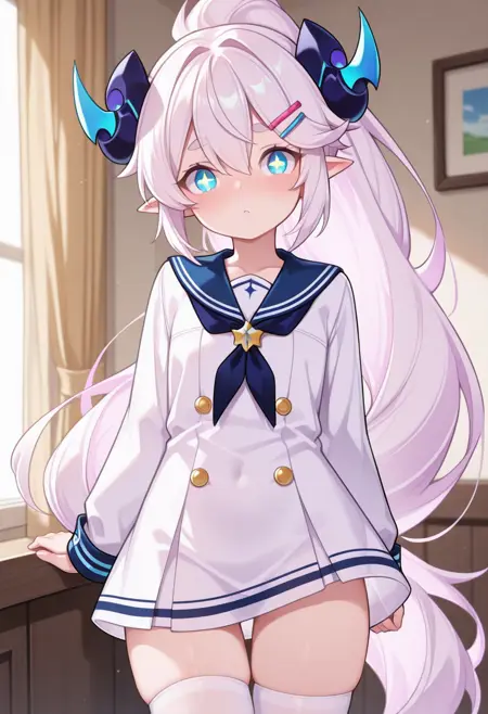 1girl, LuTMR, 白髪,ポニーテール,とても長い髪, LuTMRの髪, 青い目, lu eyes, + +, 記号形の瞳,白い瞳,尖った耳, luTMRの角, LuTMRの帽子, 帽子, LuTMRヘアクリップ, ネクタイ, LuTMRコート, コート, LuTMRシャツ, シャツ(ノースリーブ), ベルト, ショートパンツ, lutmrショートパンツ, LuTMRの尾, LuTMRの翼, 複数の翼, 悪魔の翼, 膝に絆創膏, 膝上ソックス, 破れた靴下, lutmr靴下, 靴下, luTMRブーツ, 複数のリング, リング