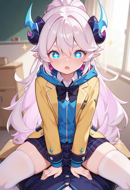 LuTMR, 白髪,ポニーテール,とても長い髪, LuTMRの髪, 青い目, lu eyes, + +, 尖った耳, ネクタイ, LuTMRの帽子, luTMRの角, LuTMRジャケット, LuTMRドレス, ベルト, 膝に絆創膏, 膝上ソックス, LuTMRヘアクリップ, LuTMRショートパンツ, luTMRブーツ, LuTMRの尾, LuTMRの翼,