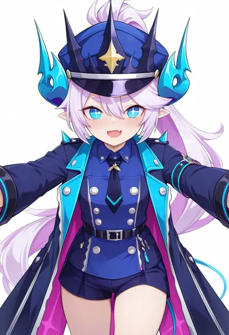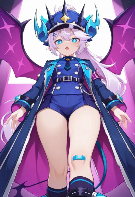 1girl, LuTMR, white hair, ponytail, very long hair, LuTMR hair, blue eyes, lu eyes, + +, symbol-shaped pupils, white pupils, pointy ears, luTMR horns, LuTMR hat, hat, LuTMR hairclip, necktie, LuTMR coat, coat, LuTMR shirt, sleeveless shirt, belt, shorts, lutmr shorts, LuTMR tail, LuTMR Wings, multiple wings, demon wings, bandaid on knee, kneehighs, torn socks, lutmr socks, socks, luTMR boots, Multiple Rings, ring