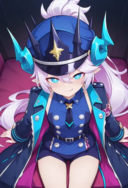 LuTMR, white hair, ponytail, very long hair, LuTMR hair, blue eyes, lu eyes, + +, pointy ears, necktie, LuTMR hat, luTMR horns, LuTMR jacket , LuTMR dress, belt, bandaid on knee, kneehighs, LuTMR hairclip, LuTMR shorts, luTMR boots,LuTMR tail, LuTMR Wings,