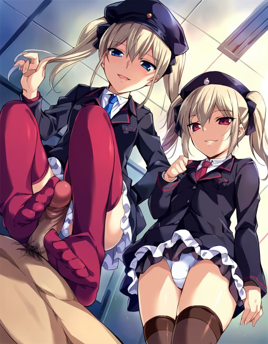 Hoshiyomi는 1boy, 교복 착용, femboy, 남성 중심, 파란 눈이고, Tsukiyomi는 1girl, 붉은 눈, 작은 가슴입니다.