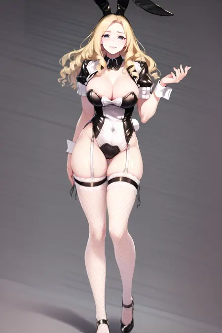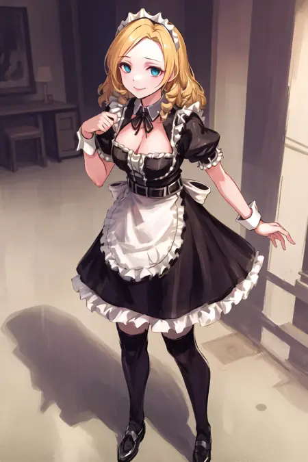 더 나은 결과를 위해 "빛나는 금발, 허벅지까지 오는 양말, 드릴 스타일 헤어, 볼륨 있는 볼륨, 목걸이, 메이드, 원피스, 프릴, 벨트, 파란 눈"을 추가해 주세요.