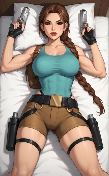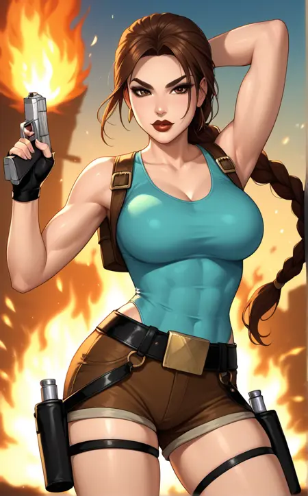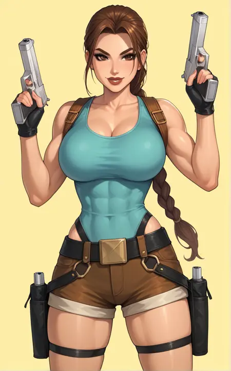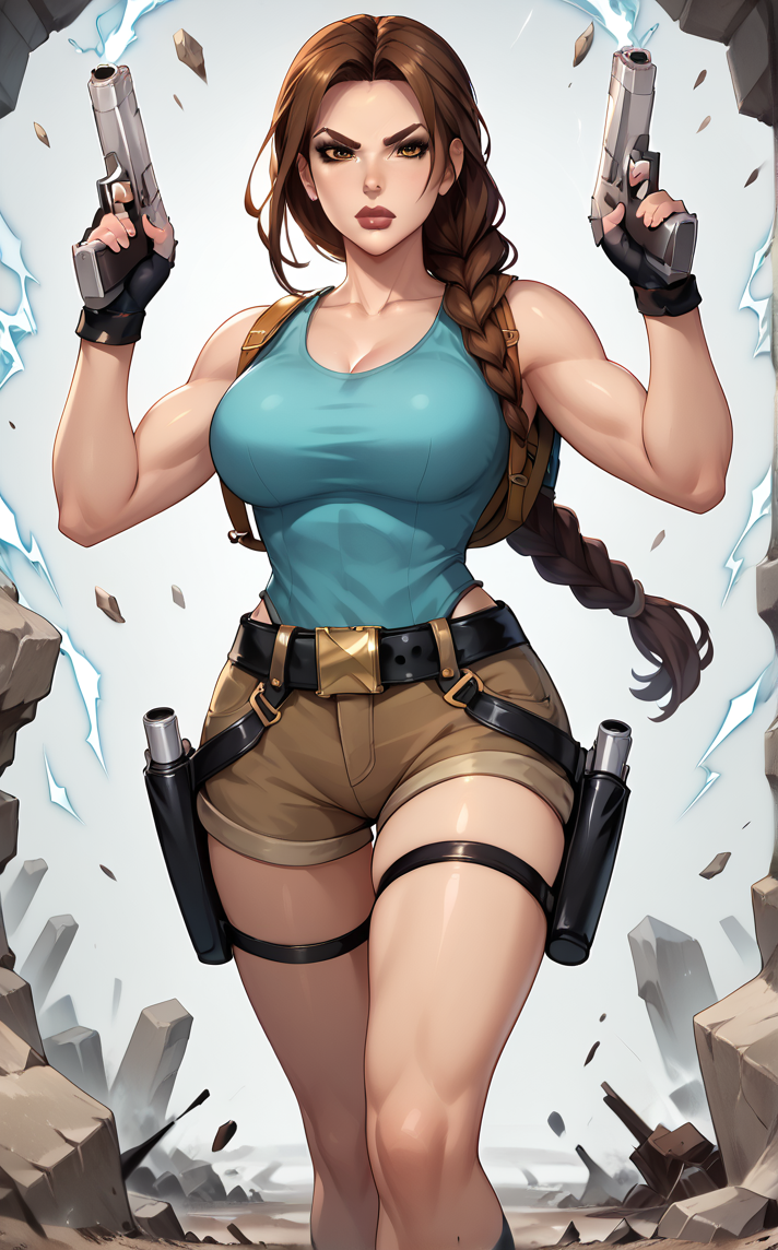 PONYXL_LaraCroft_Classic_ownwaifu, 1girl, sidelocks, brown hair, lips, brown eyes, ponytail, long hair, single braid, belt buckle, black belt, brown shorts, cleavage, green tank top, fingerless gloves, backpack, shoulder holster, nose, thigh holster, short shorts, large breasts, pistol, sleeveless, black gloves, trigger discipline, bare shoulders, finger on trigger, thigh strap, makeup, taut clothes, braided ponytail, lipstick, hair over shoulder, long braid, holster, m1911, collarbone, highleg, holstered weapon, toned, forehead, belt pouch, thigh pouch, narrow waist, suspenders, thick eyebrows, parted bangs, hair behind ear, impossible clothes,