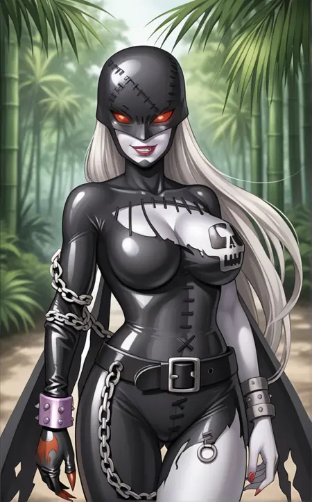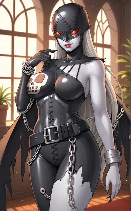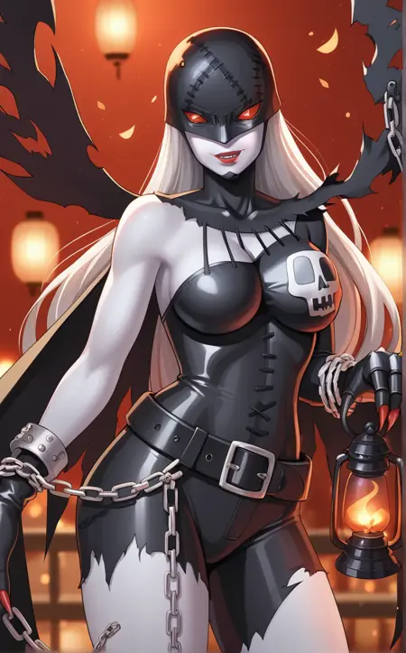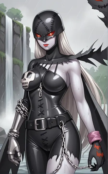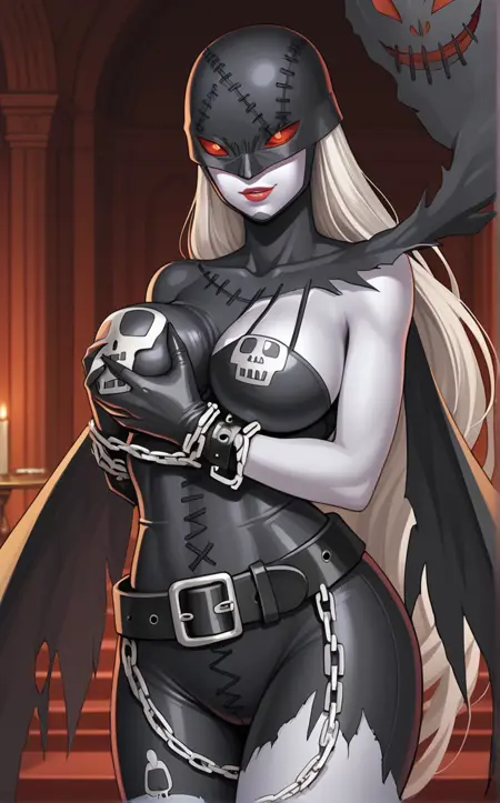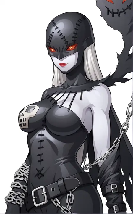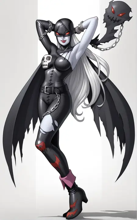PONYXL_Digimon_LadyDevimon_ownwaifu, mask, 1girl, digimon (creature), red eyes, colored skin, white hair, long hair, stitches, demon girl, helmet, large breasts, asymmetrical clothes, chained, claws, cuffs, bodysuit, shackles, belt, wings, chain, broken chain, glowing eyes, skull print, black bodysuit, gloves, lipstick, chain necklace, cape, makeup, pale skin, skull, torn wings, leash, spikes, black wings, black belt, cleavage, vampire, black gloves, buckle, elbow gloves, red lips, angel wings, impossible clothes, single glove, skin tight, asymmetrical legwear, collarbone, demon wings, gauntlets, very long hair,