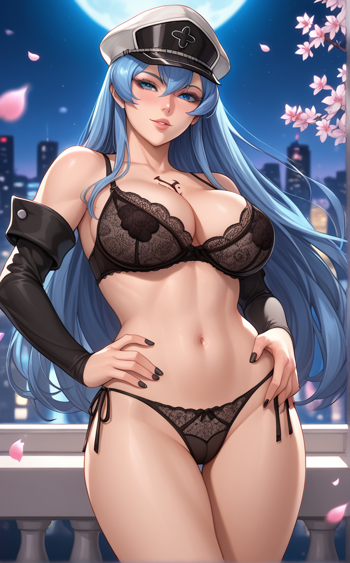 BlackBra_Esdeath_ownwaifu, 1girl, 裸露肩膀, 蓝眼, 胸部纹身, 彩色睫毛, 发丝遮眼, 侧发, 蓝发, 深沟, 大胸, 黑色胸罩, 锁骨, lingerie, 黑色内裤, 嘴唇, 军帽, 肚脐, 尖顶帽, 刘海, 分离袖, 仅穿内衣, 白色头饰, 内衣, 黑色指甲, 蕾丝边, 蕾丝边胸罩, 指甲油, 大腿, 花卉印花, 蕾丝胸罩, 蕾丝边内裤, 侧系内裤, 大发,