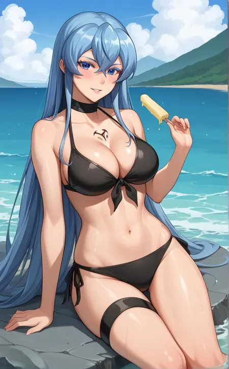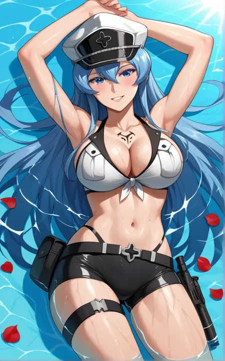 MicroBikini_Esdeath_ownwaifu, 1girl, 裸露肩膀, 蓝眼, 蓝发, 胸部纹身, 项圈, 深沟, 彩色睫毛, 交叉吊带, 发丝遮眼, 吊带领, 心形, 军帽, 尖顶帽, 马尾, 侧发, 白色头饰, 锁骨, 大胸, 嘴唇, 泳衣, 黑色比基尼, 黑色手套, 高腿比基尼, 微型比基尼, 鼻尖泛红, 阴部纹身, 绳式比基尼, 紧致身材, 无指手套, 身体文字, 妆容, 指甲油, 肚脐, 肚脐穿孔, 彩色阴毛, 厚大腿, 大腿, 宽臀,