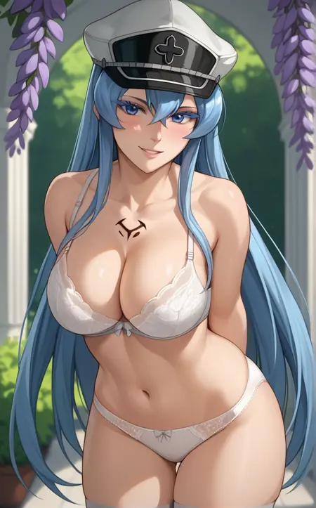WhiteBra_Esdeath_ownwaifu, 1girl, 蓝眼, 蓝发, 胸部纹身, 彩色睫毛, 发丝遮眼, 侧发, 深沟, 锁骨, 大胸, 刘海, 裸露肩膀, 肚脐, 尖顶帽, 白色胸罩, 军帽, 白色头饰, 内衣, 鼻子, 白色内裤, 白色过膝袜, 蕾丝边胸罩, 蕾丝边内裤, 大腿, 仅穿内衣,