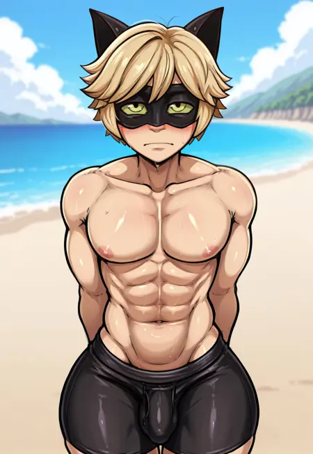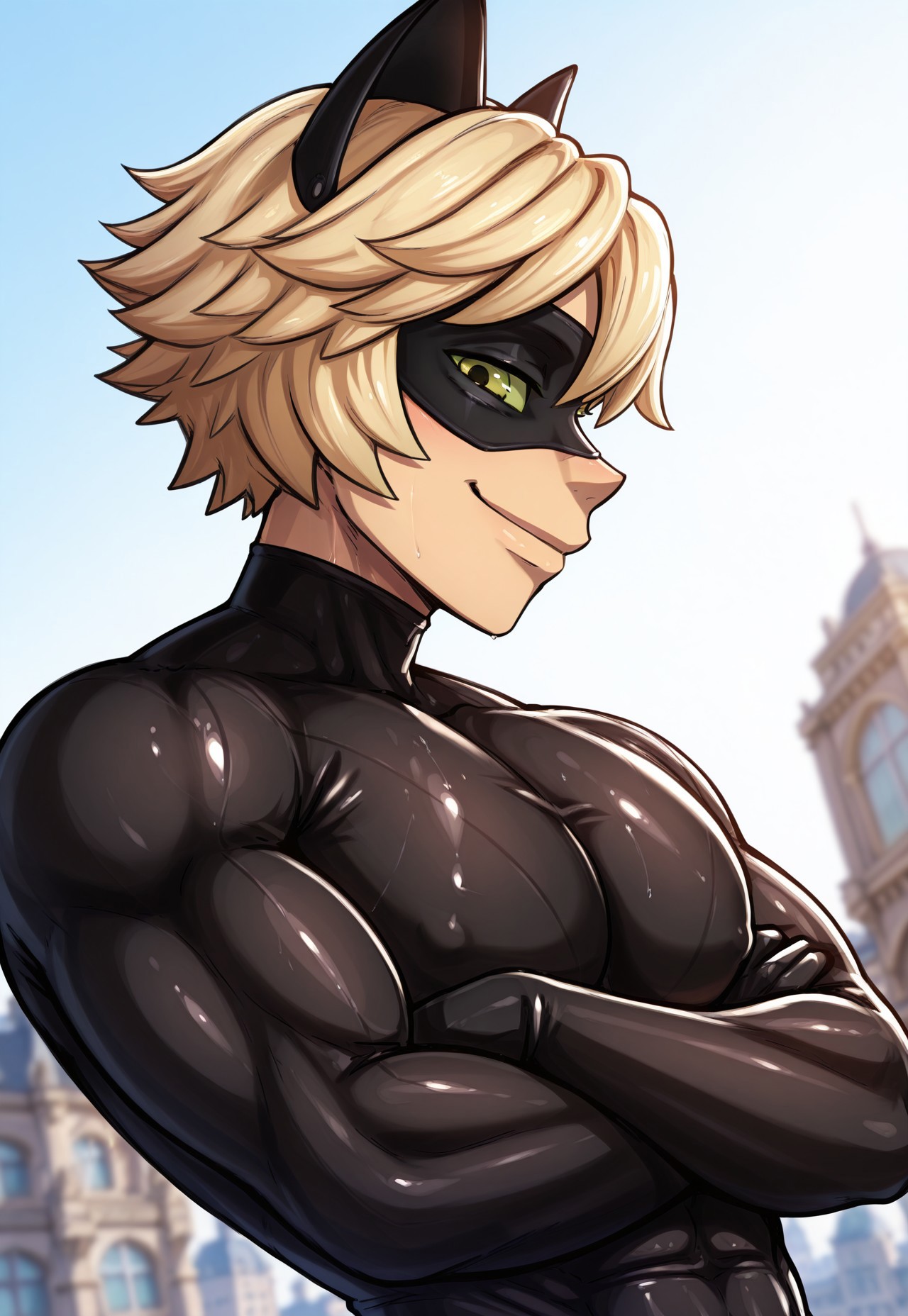 主提示词:Cat Noir (Yorun),金色头发,绿色眼白,面具,猫耳