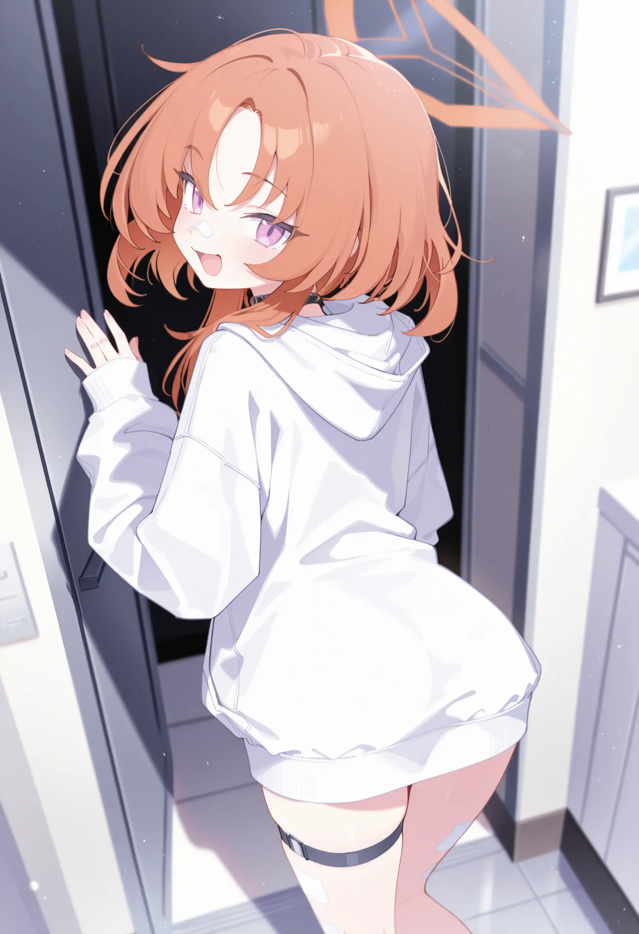 rei-default,rei \(blue archive\),purple eyes, orange hair, medium hair, halo,baseball cap, orange-tinted eyewear, white hoodie, blue jacket,multicolored jacket, thigh strap,bandaid,black socks,sneakers,