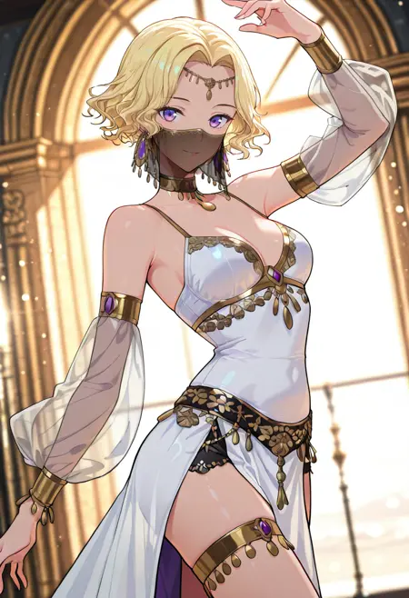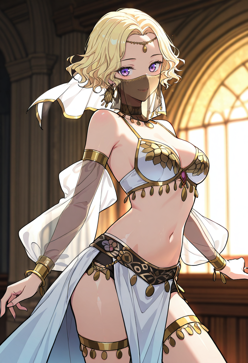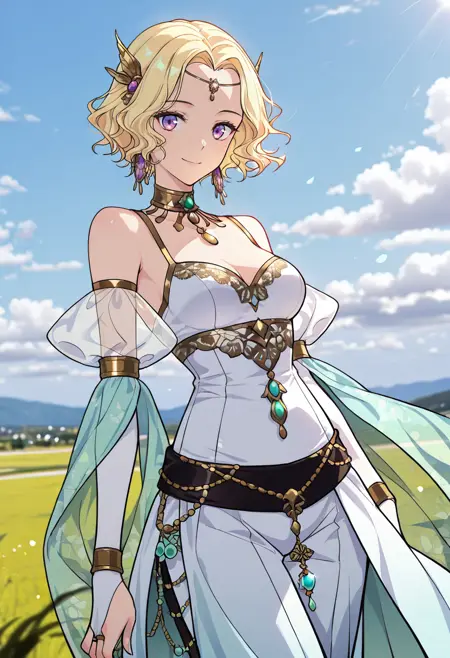 Princia De Rua, blonde hair, short hair, wavy hair, pruple eyes, parted bangs, forehead,
