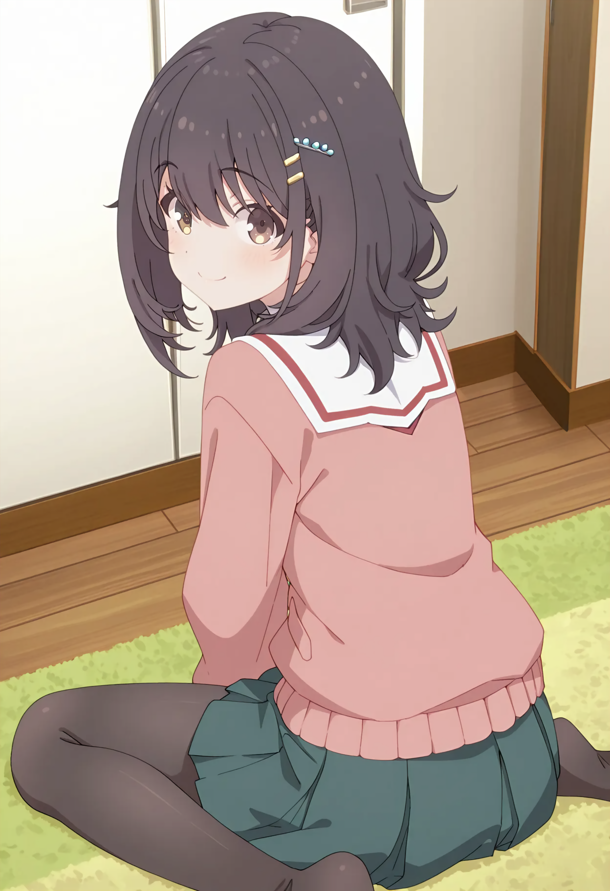 kawaimako-default,brown eyes,black hair, medium hair,hairclip, pink cardigan, white sailor collar,white shirt, green skirt,black pantyhose,sneakers