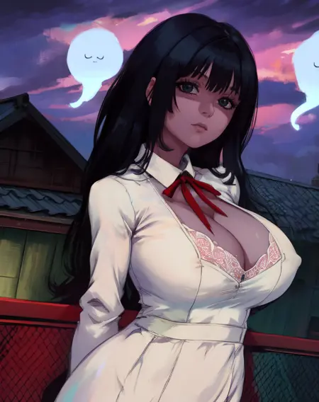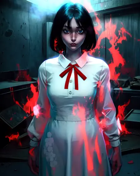 흰 드레스, 빨간 목걸이 리본, --- 맨발 또는 빨간 신발