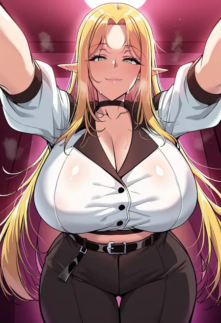 雷克尔:requre_(isekai_fall_of_the_hero),锐利的绿色眼睛,美丽的金色长发,巨大而蓬松的乳房,尖耳精灵特征,迷人的精灵女性,