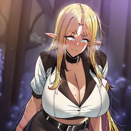 雷克尔:requre_(isekai_fall_of_the_hero),锐利的绿色眼睛,美丽的金色长发,巨大而蓬松的乳房,尖耳精灵特征,迷人的精灵女性,