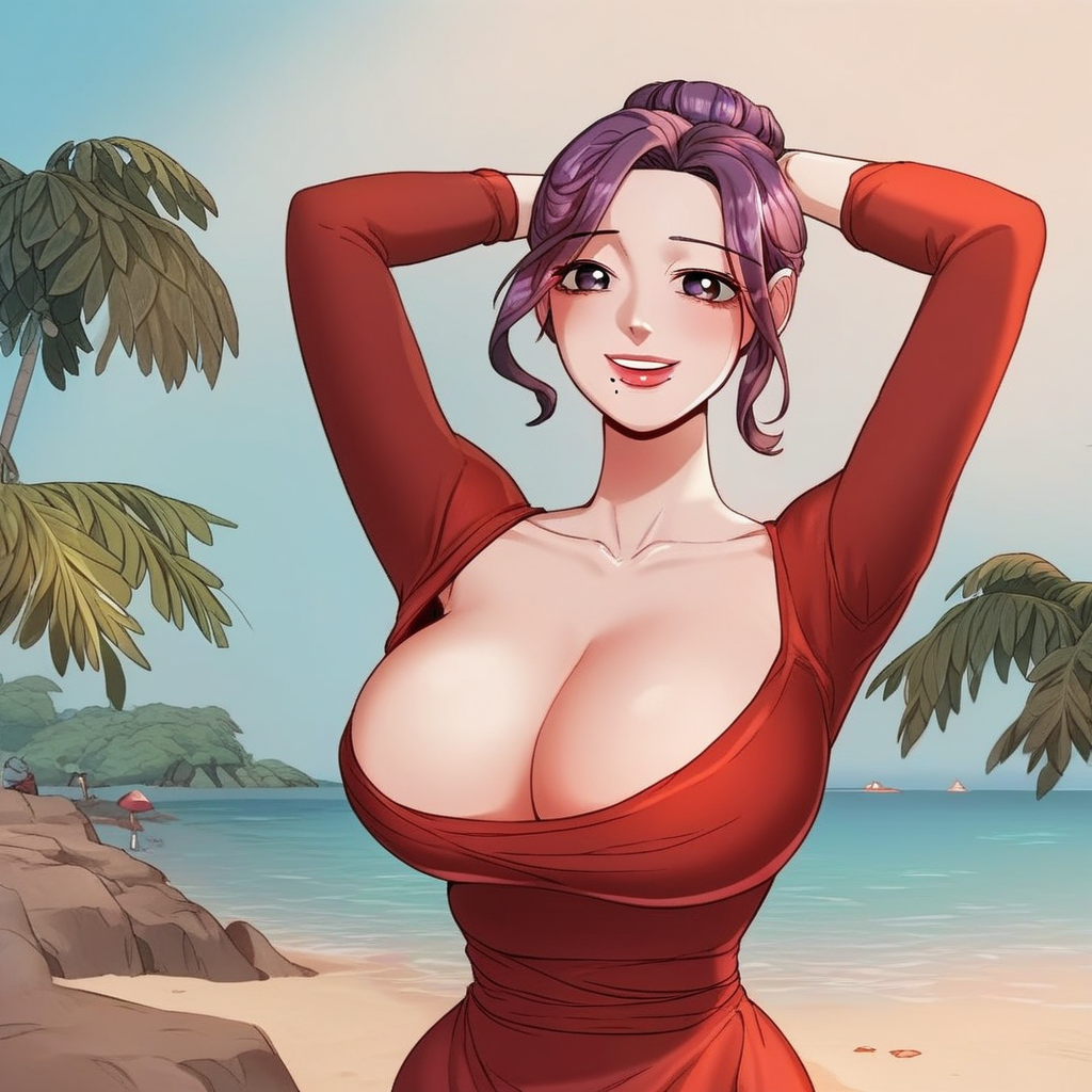 性感女上司:the_milf_boss_(part_time_job),漂亮紫色眼睛,漂亮紫色头发,发髻,巨大蓬松的胸部,嘴下右侧脸颊有一颗痣