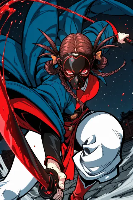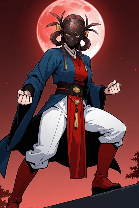 触发面具:SisMonk,面具,红眼,棕发,发圈,辫子,双马尾,发带,外衣,汉服,长袖,宽袖,腰带,腰饰,pelvic curtain,白裤,红靴