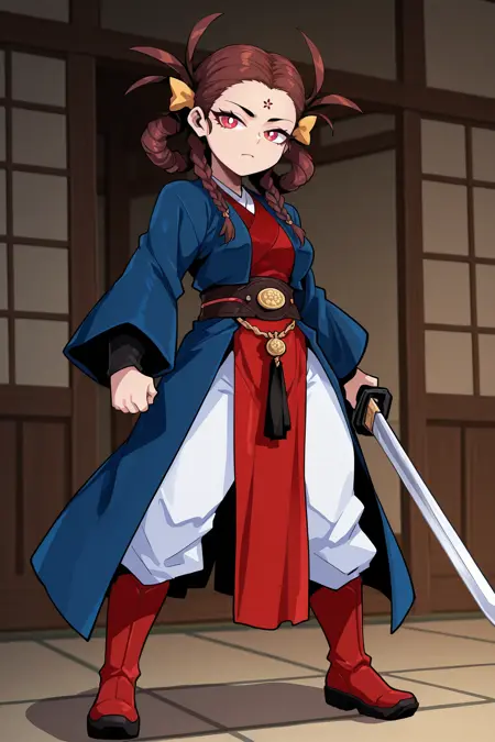 触发词:SisMonk,额头标记,红眼,分发,棕发,发圈,辫子,双马尾,发带,外衣,汉服,长袖,宽袖,腰带,腰饰, pelvic curtain,白裤,红靴