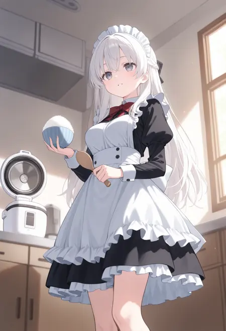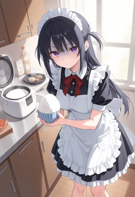 每个触发词单独使用即可生效,若要盛饭,请加入“rice bowl”。大多数情况下饭会盛在特大碗中,但这是学习素材的不可抗力所致。