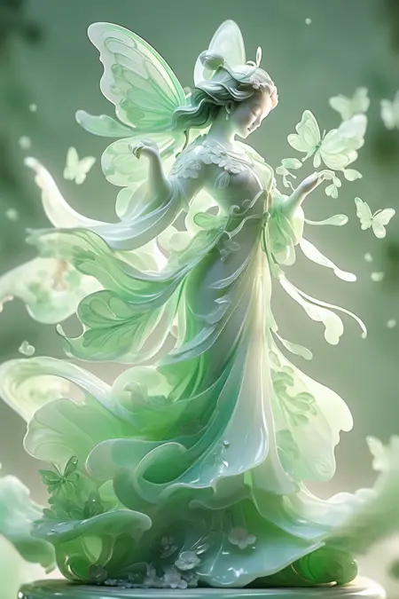 套词:masterpiece,best quality,jade,jade sculpture,1 girl,looking at viewer,Strapless dress,bare shoulders,short hair,dancing, butterfly, butterfly wings, front light,cinematic light