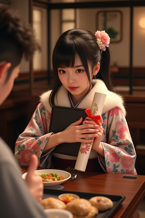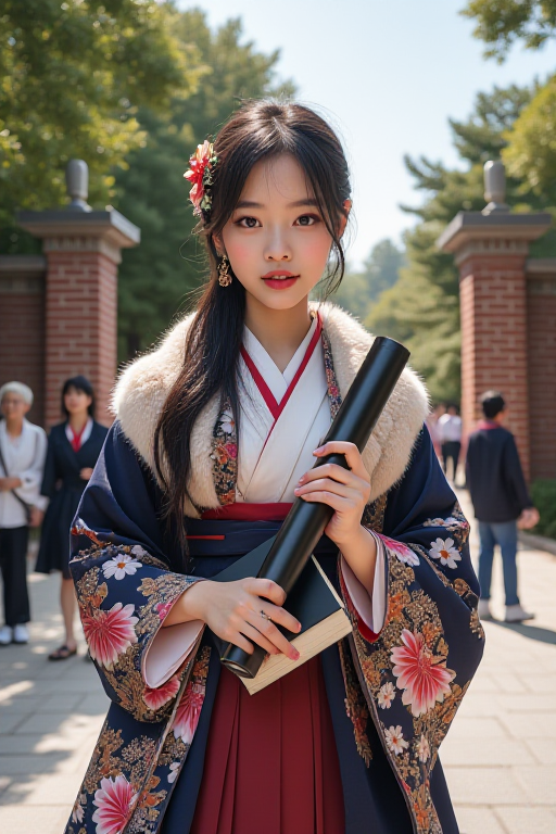注意:女孩的手指通常不太健康,因此需要多次尝试才能生成图像。你可以更改毕业证书卷轴的颜色,大多数颜色都可以。(Flux)